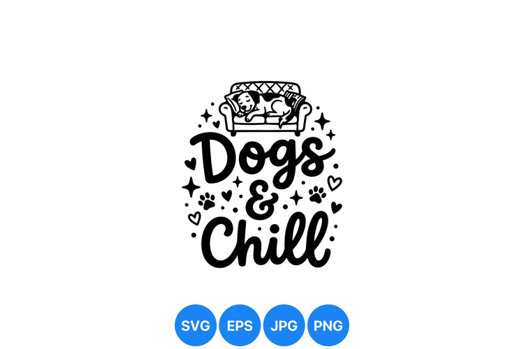Relaxed dog sleeps peacefully on couch above playful dogs and chill hand lettering surrounded by hearts paw prints and sparkles in black and white minimal style