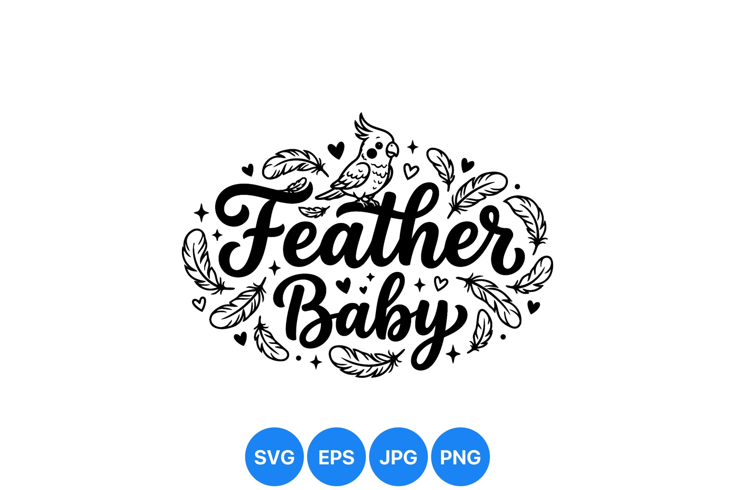 Hand drawn vector illustration features a cockatiel bird sitting above the phrase feather baby with scattered feathers and hearts on white background peaceful and charming design