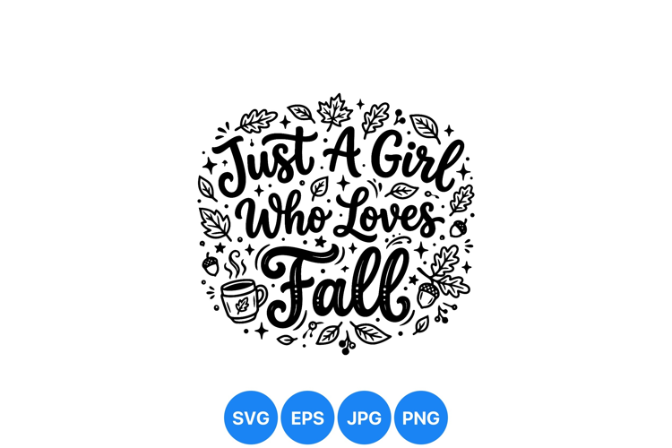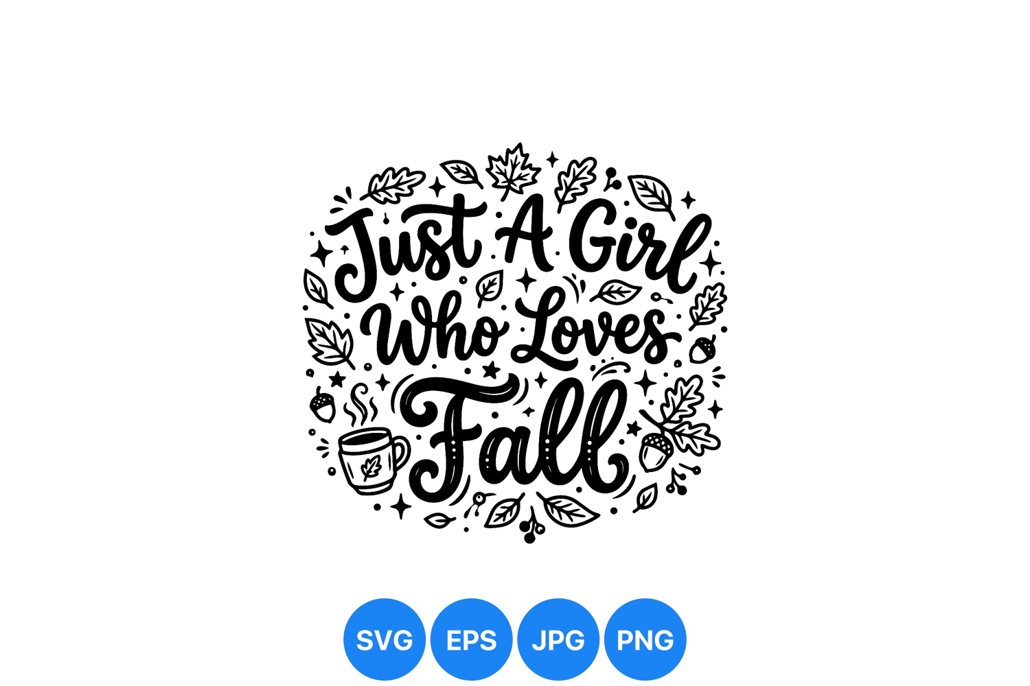 Decorative hand lettering design displays the phrase just a girl who loves fall with autumn leaves and acorns in a cozy seasonal style perfect for seasonal apparel or prints vibrant mood