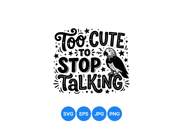 Playful hand lettering design features the phrase too cute to stop talking with a detailed parrot illustration surrounded by decorative stars and dots in black and white style.