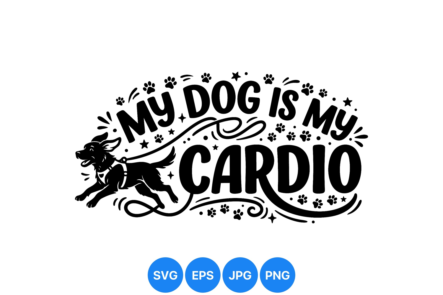 Energetic black dog silhouette runs joyfully with leash beside motivational phrase my dog is my cardio in bold typography surrounded by paw prints in playful graphic style