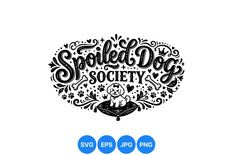 Intricate black and white vector art shows ornate spoiled dog society lettering surrounding a small dog on a decorative cushion with paw prints hearts and bones, playful and charming mood.