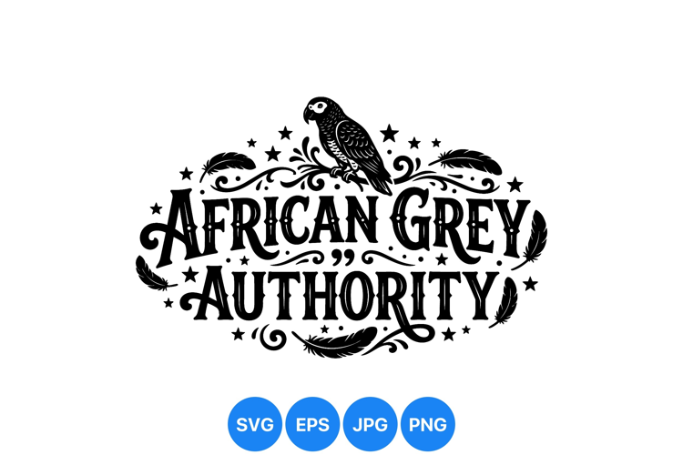 Vintage black and white vector design featuring an african grey parrot perched above decorative feathers stars and swirling flourishes with bold lettering creating a classic ornamental style