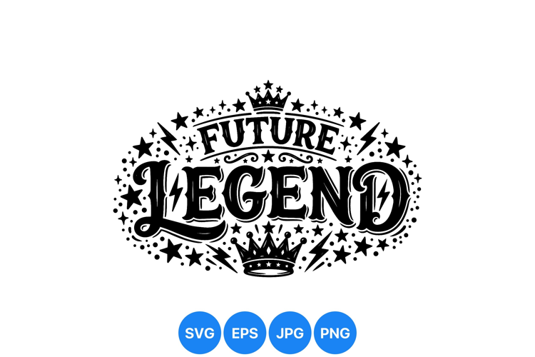A bold black and white vintage style typographic composition featuring the words future legend decorated with crowns stars and lightning bolts creating a classic powerful vibe