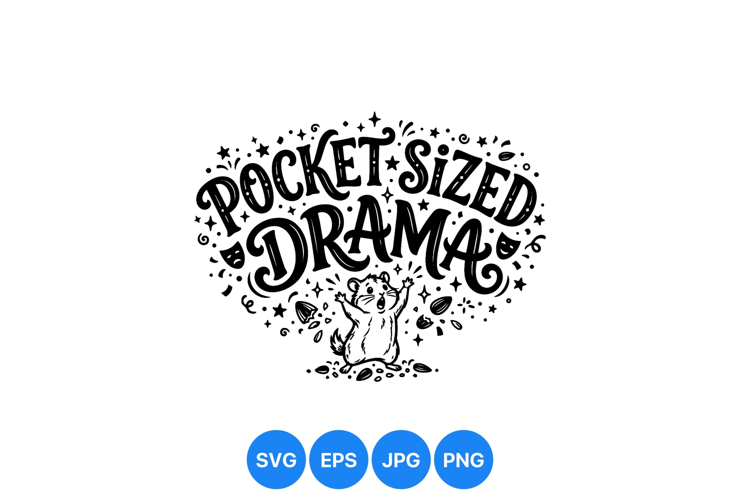 Whimsical black and white vector art shows a small hamster raising its paws under the phrase pocket sized drama surrounded by stars and curls for branding or apparel uses with playful charm