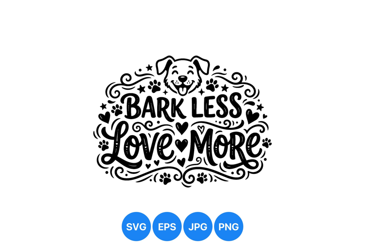 A hand lettering quote reads bark less love more surrounded by paw prints hearts and a happy dog face conveying warmth and positivity in a playful style