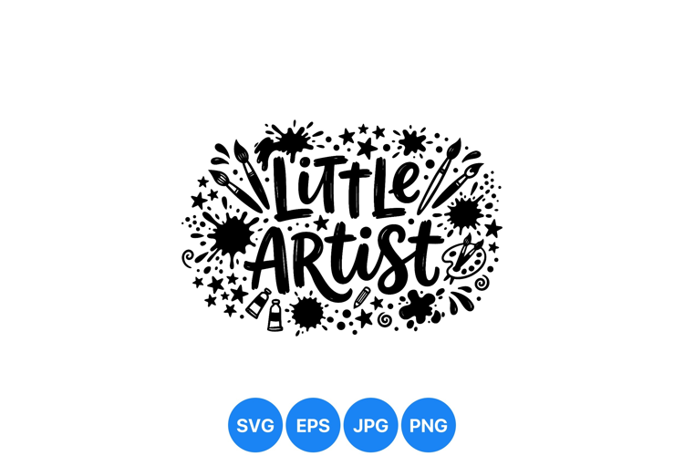 Hand drawn black and white lettering spelling little artist surrounded by paint brushes palette splashes and stars in a playful creative style