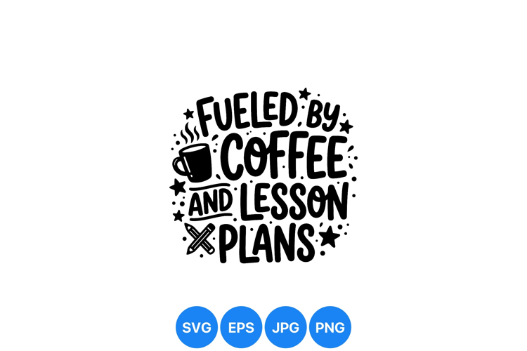 Hand drawn lettering saying fueled by coffee and lesson plans with coffee cup and pencils in minimalist black and white vector illustration style for educational themes and teacher gifts