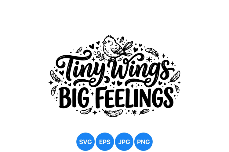 Hand drawn black and white lettering phrase tiny wings big feelings with a small bird, decorative feathers, hearts, and stars creating an elegant and playful design.