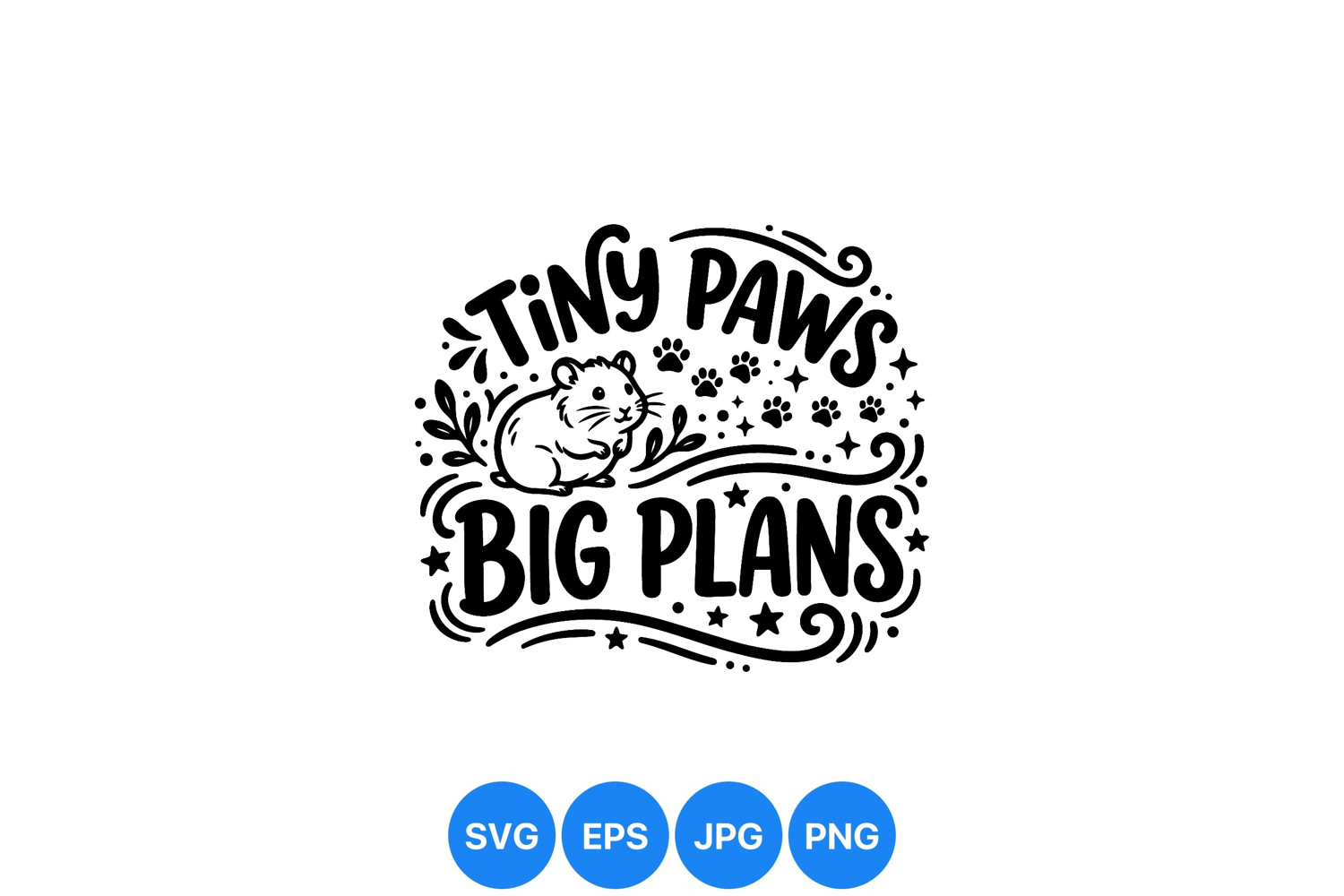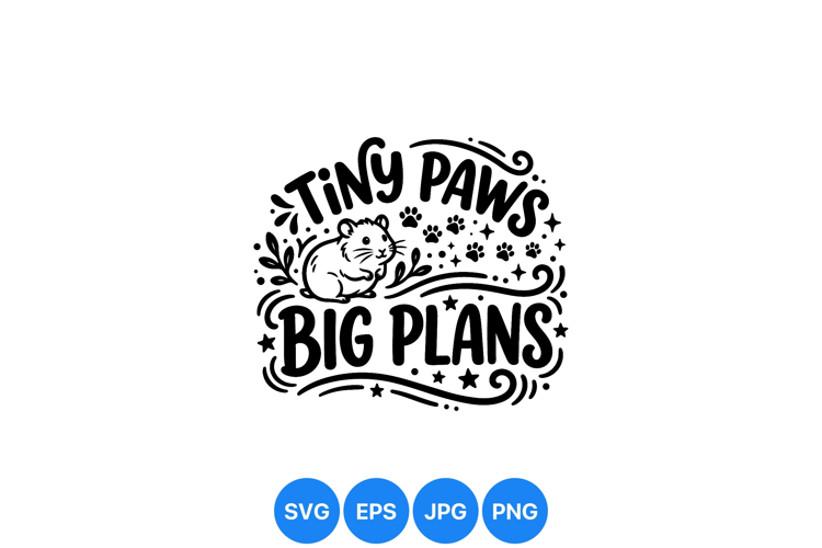 A cute small hamster sits in black and white vector style with decorative paw prints stars and swirls framing the text tiny paws big plans creating a motivational and playful mood