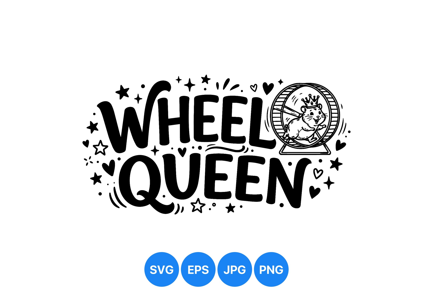 Whimsical black and white vector art shows a crowned hamster running on a wheel surrounded by decorative stars hearts and playful typography spelling wheel queen fun lively design