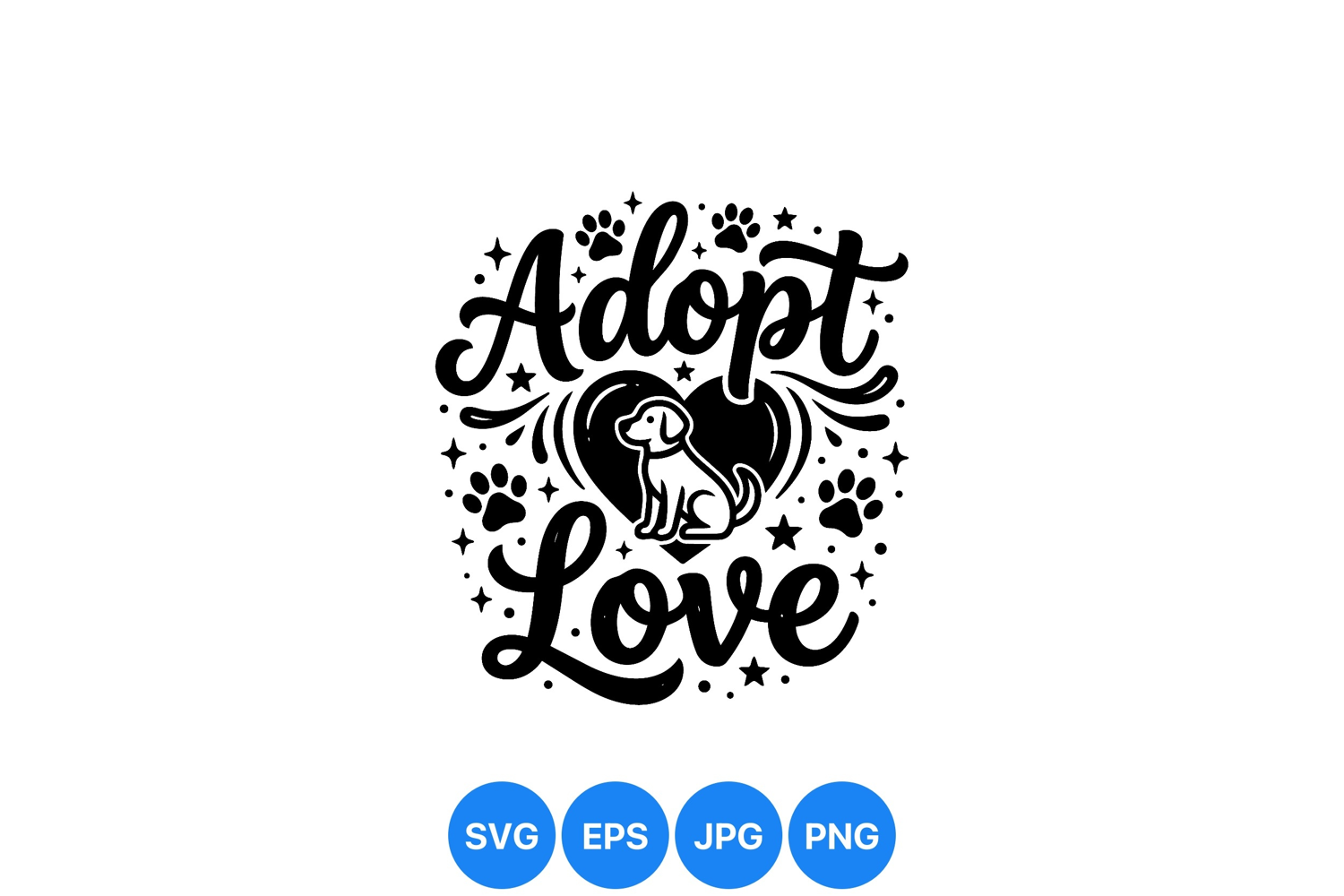 Stylized adopt love text with a small dog silhouette inside a heart emblem surrounded by paw prints and stars in black and white vector style conveying pet adoption and care.