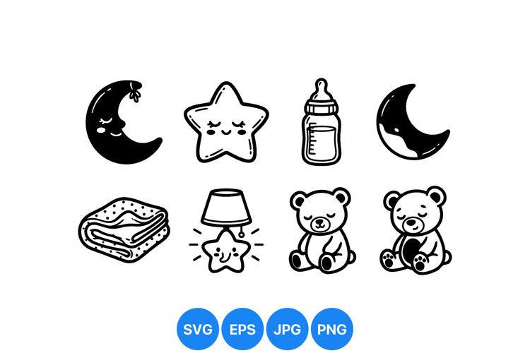 A of charming black and white cartoon icons featuring sleeping moon, star, teddy bear, baby bottle, lamp, and blanket in a cute simple vector style for childrens design.