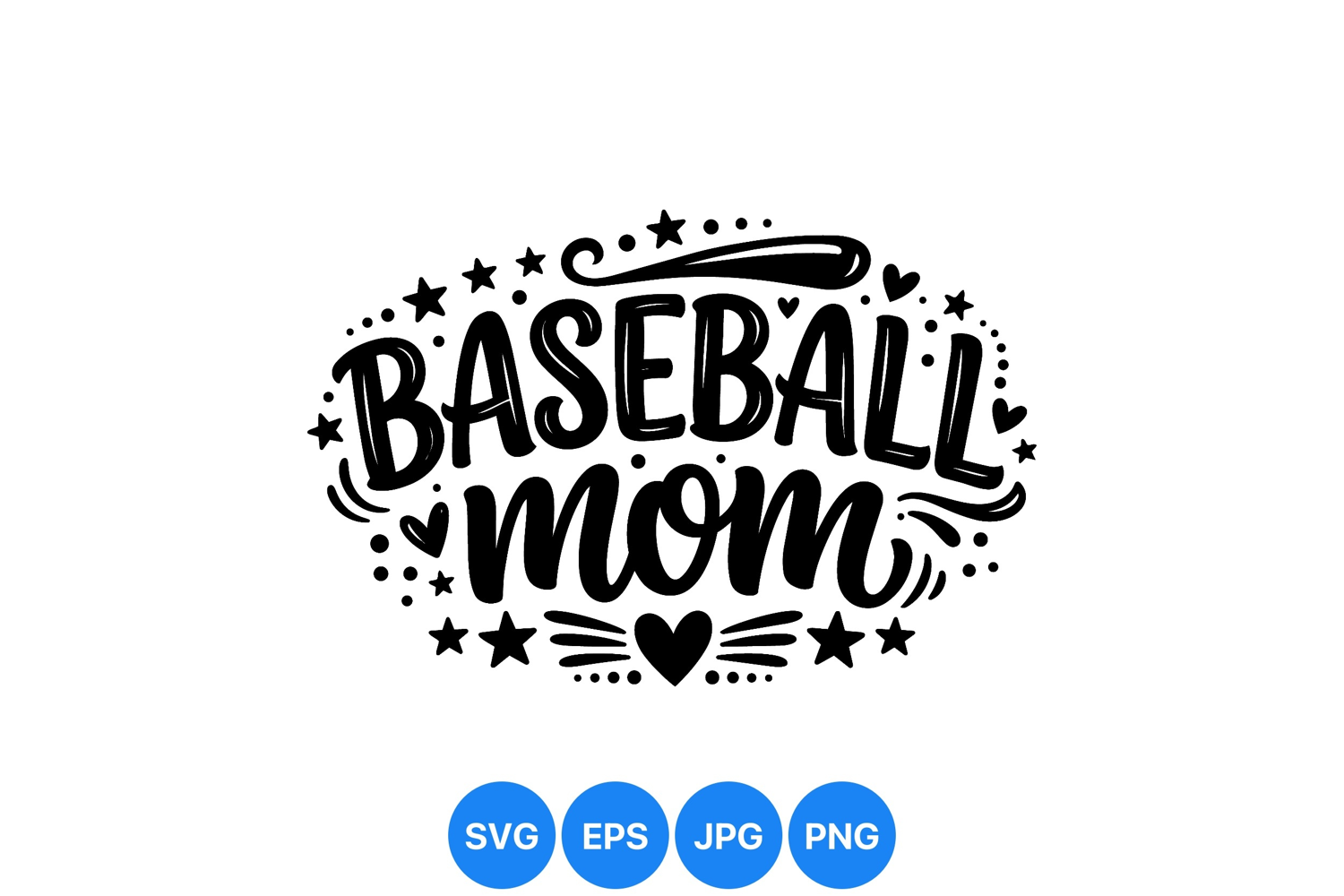 Bold black hand lettering spells baseball mom surrounded by stars hearts and decorative dots showing supportive attitude perfect for apparel and gifts design
