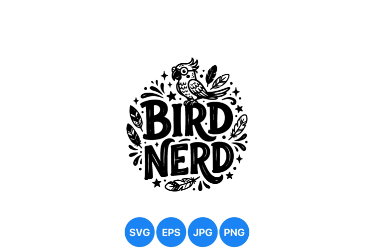 A playful black and white vector design showcases a smiling parrot wearing glasses above bold bird nerd lettering with decorative feathers and stars in whimsical style creating vibrant mood