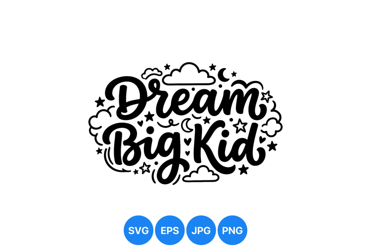 A playful hand lettering design illustrating the phrase dream big kid surrounded by stars clouds and hearts in black vector art style suitable for kids apparel and motivational prints.