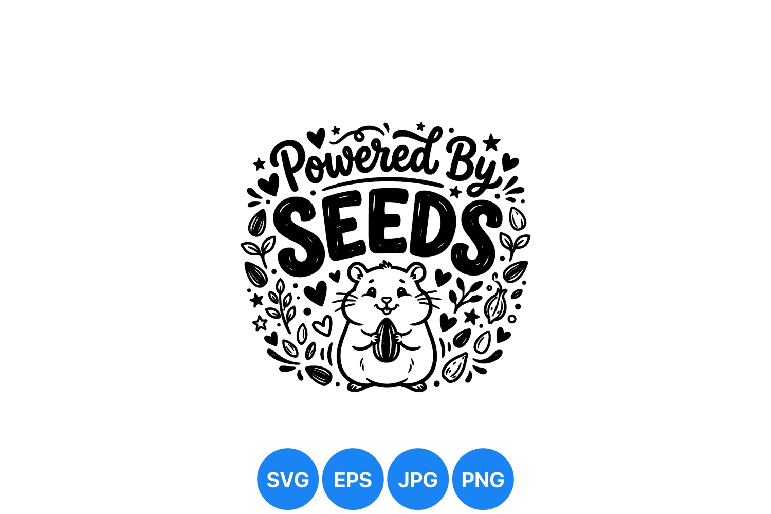 Adorable hamster clutches a sunflower seed amid an arrangement of seeds and leafy branches with playful powered by seeds text in bold black vector style