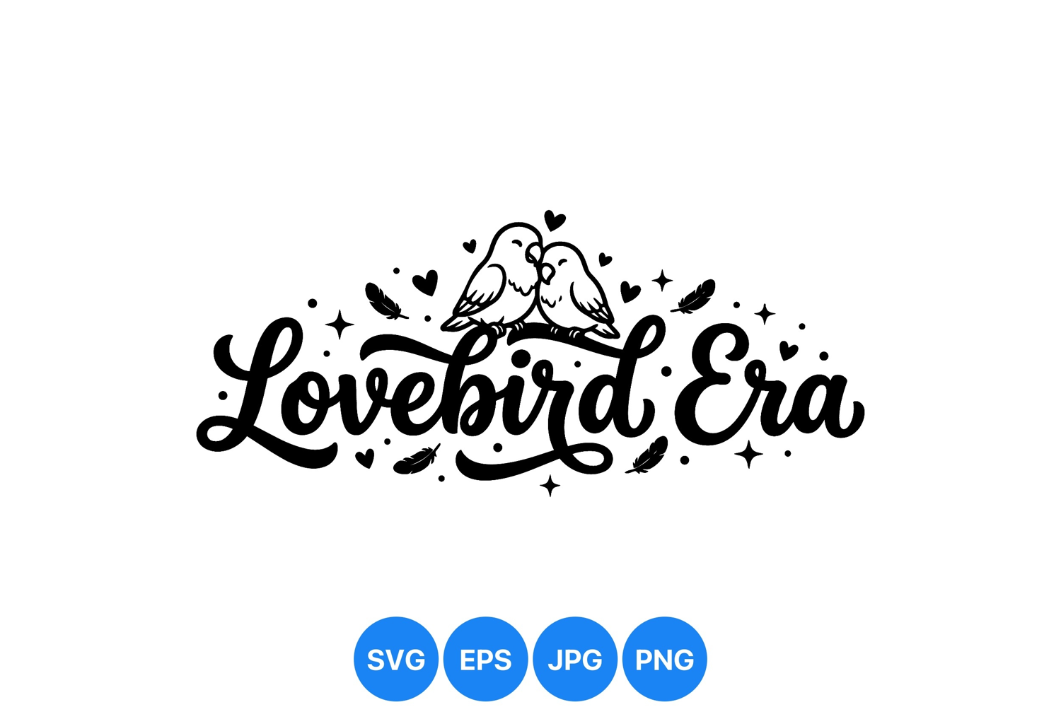 Elegant black and white vector features two lovebirds sitting closely atop flowing script text lovebird era surrounded by heart shapes feathers and star sparkles in romantic style