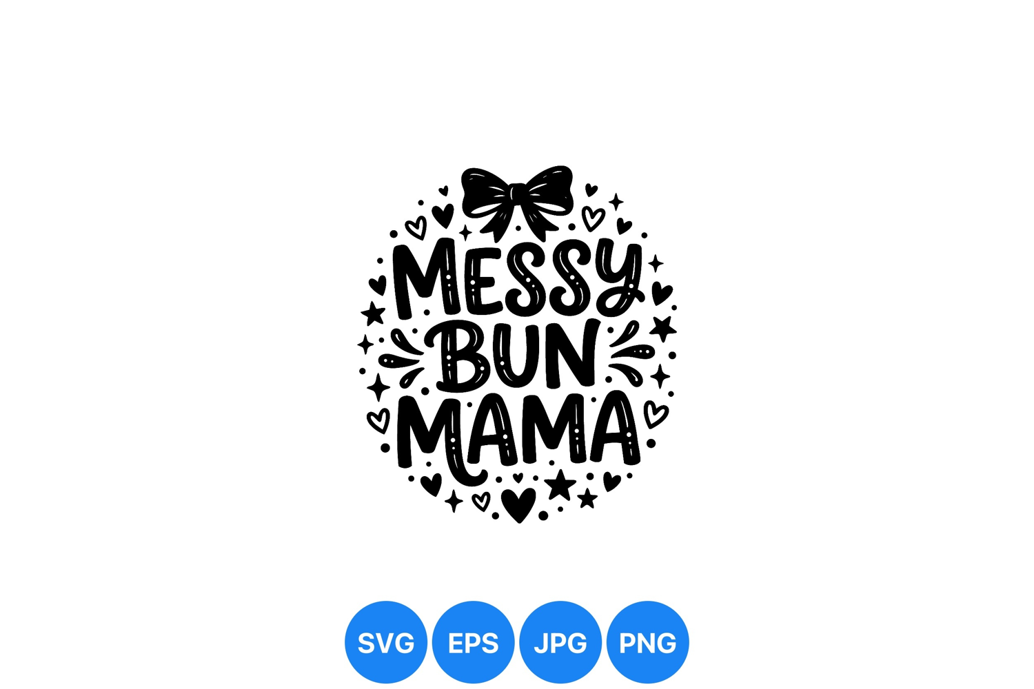 Hand drawn lettering saying messy bun mama surrounded by bow hearts and stars in black vector style for apparel or print design with playful and charming mood