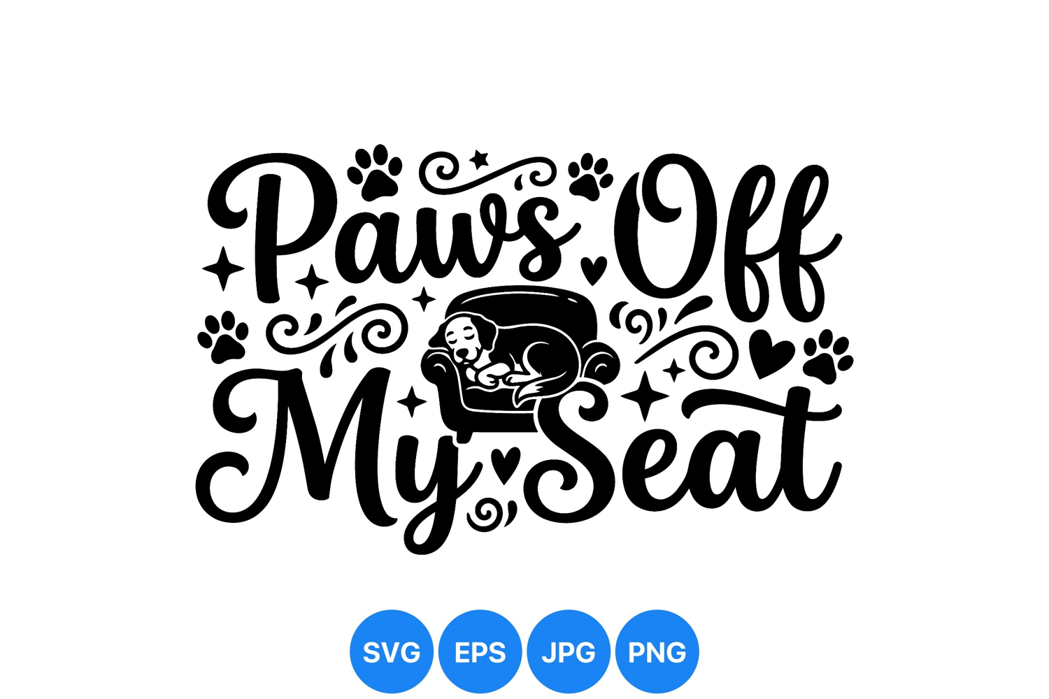 Bold vector art showing a dog curled up on an armchair surrounded by playful paws off my seat lettering and decorative highlights in black silhouette style creating a cozy mood