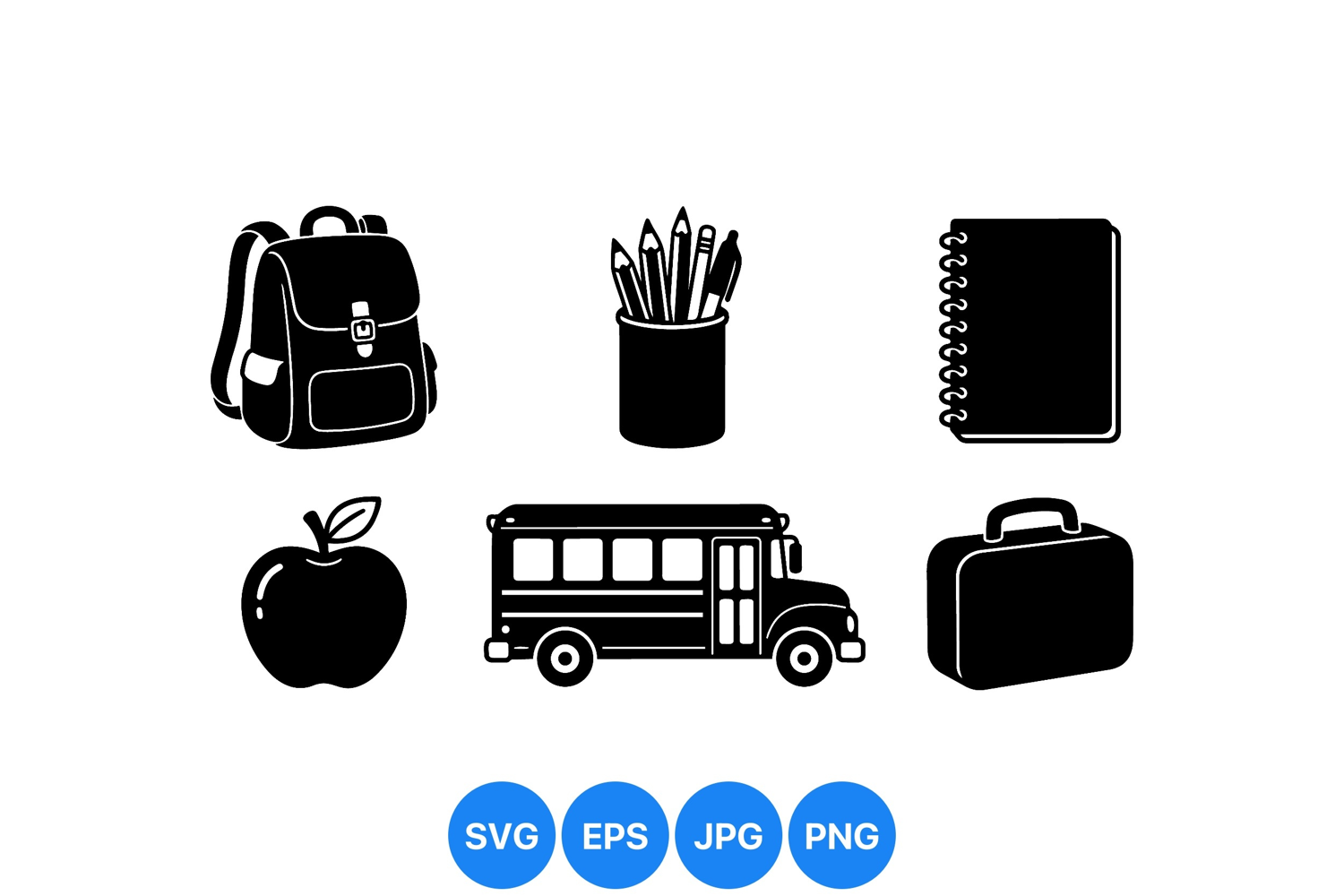 Simple black and white vector icons show essential school supplies including backpack apple pencils school bus briefcase and notebook in minimal flat design style for education themes.