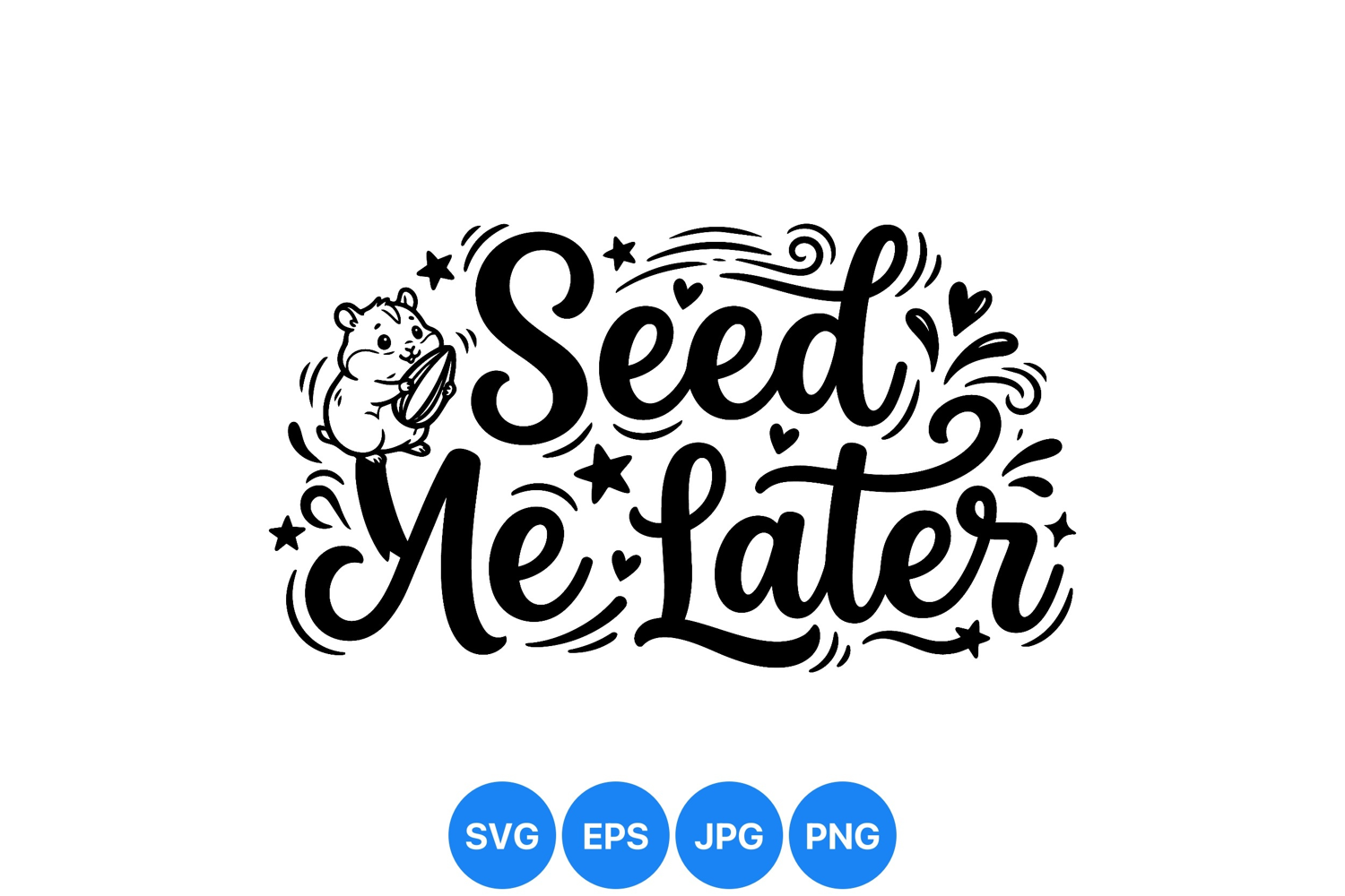 Playful black and white vector art depicts a joyful hamster clutching a seed beside playful seed me later typography surrounded by stars hearts and decorative swirls creating a cheerful mood