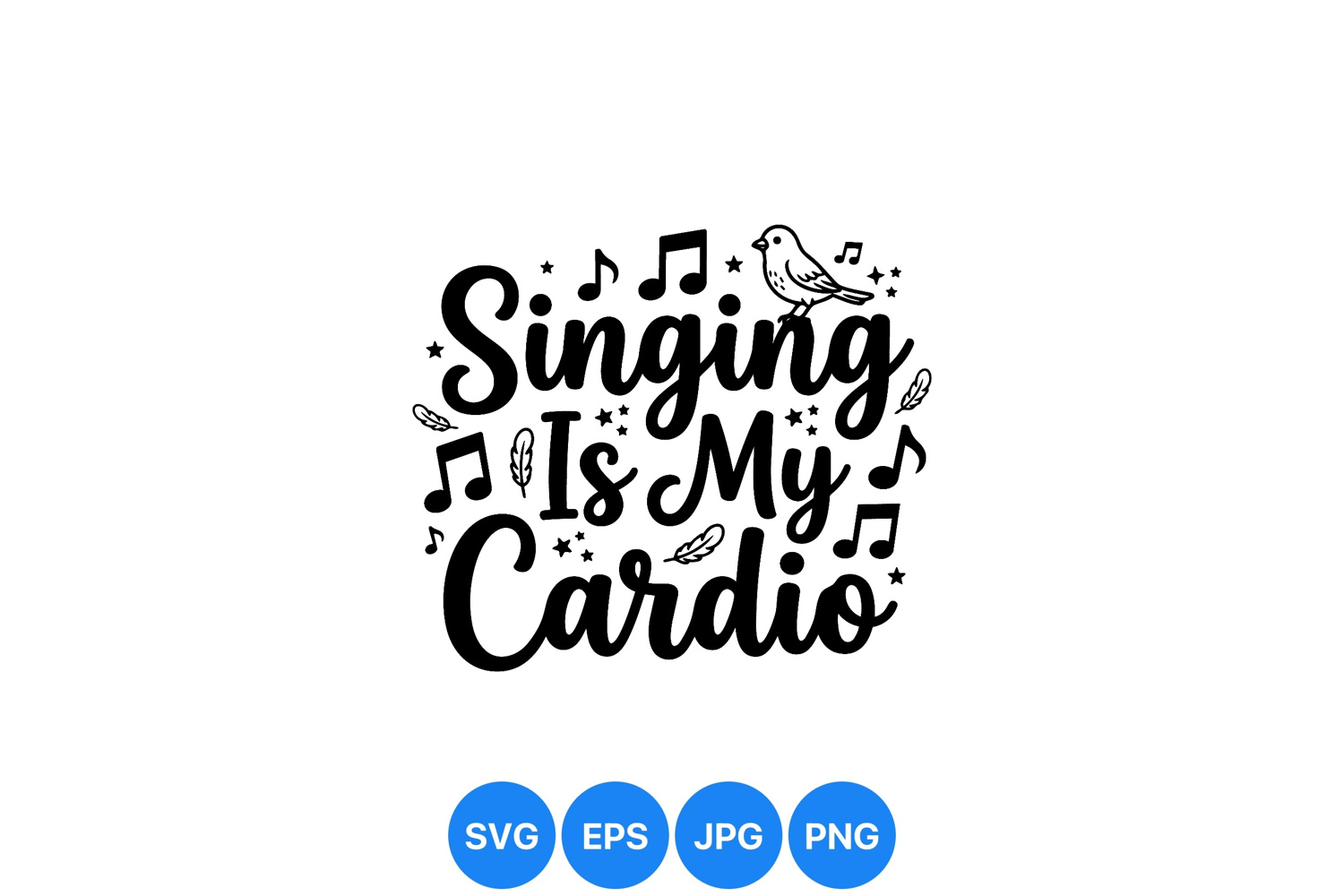 Bold black typography spells out singing is my cardio with decorative musical notes feathers stars and a small bird emphasizing music passion and fitness energy