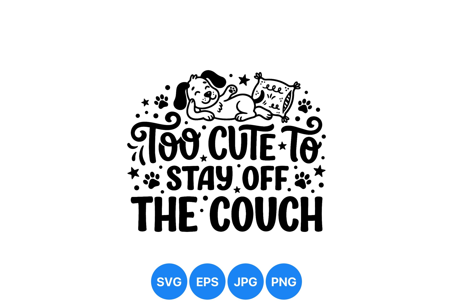Playful black and white hand lettering with a happy dog lying next to a pillow above the text too cute to stay off the couch creating a fun cozy mood.