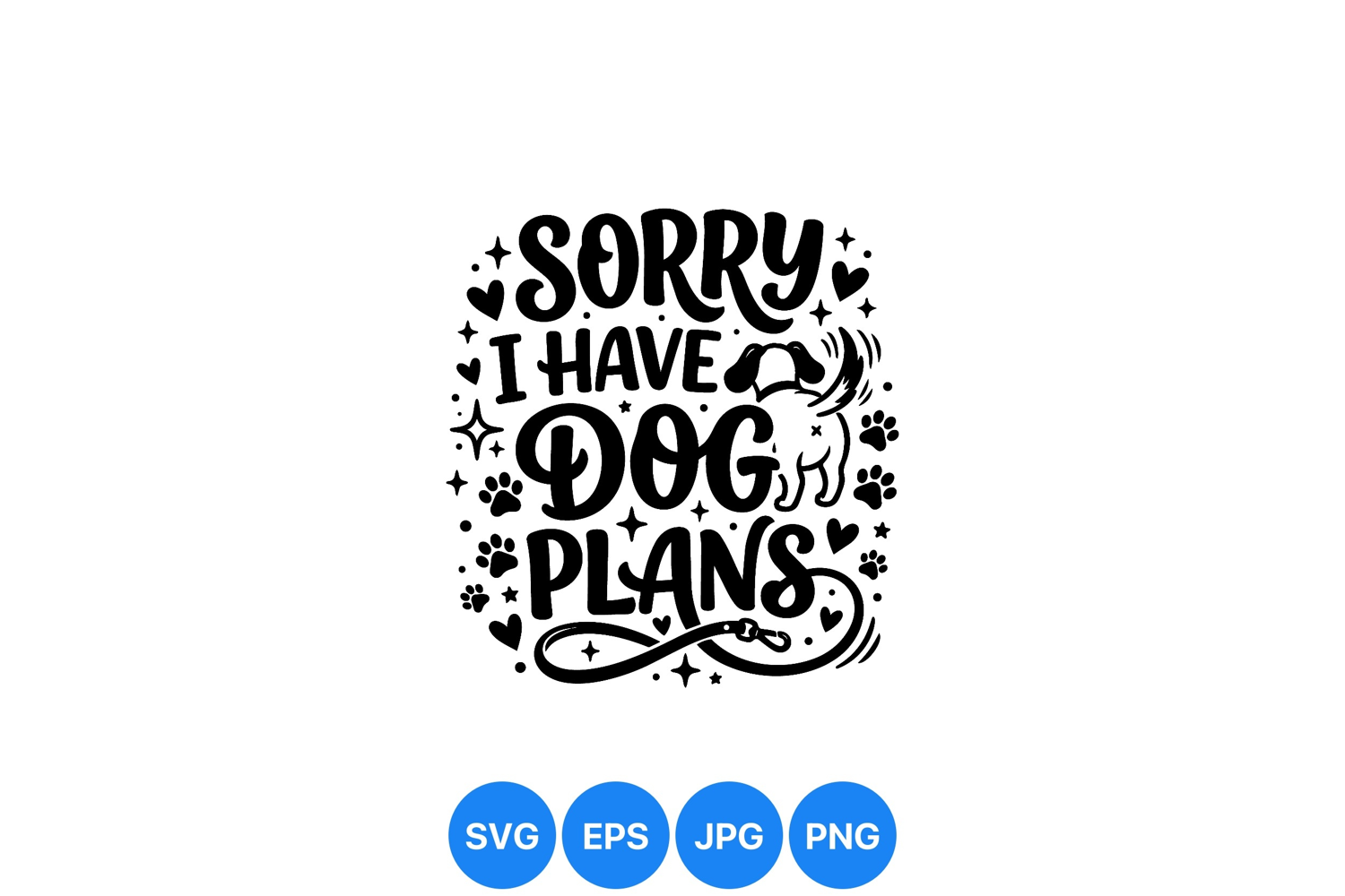 A whimsical black and white vector illustration featuring the phrase sorry i have dog plans with playful dog, paw prints, hearts, and stars in a joyful style perfect for pet lovers
