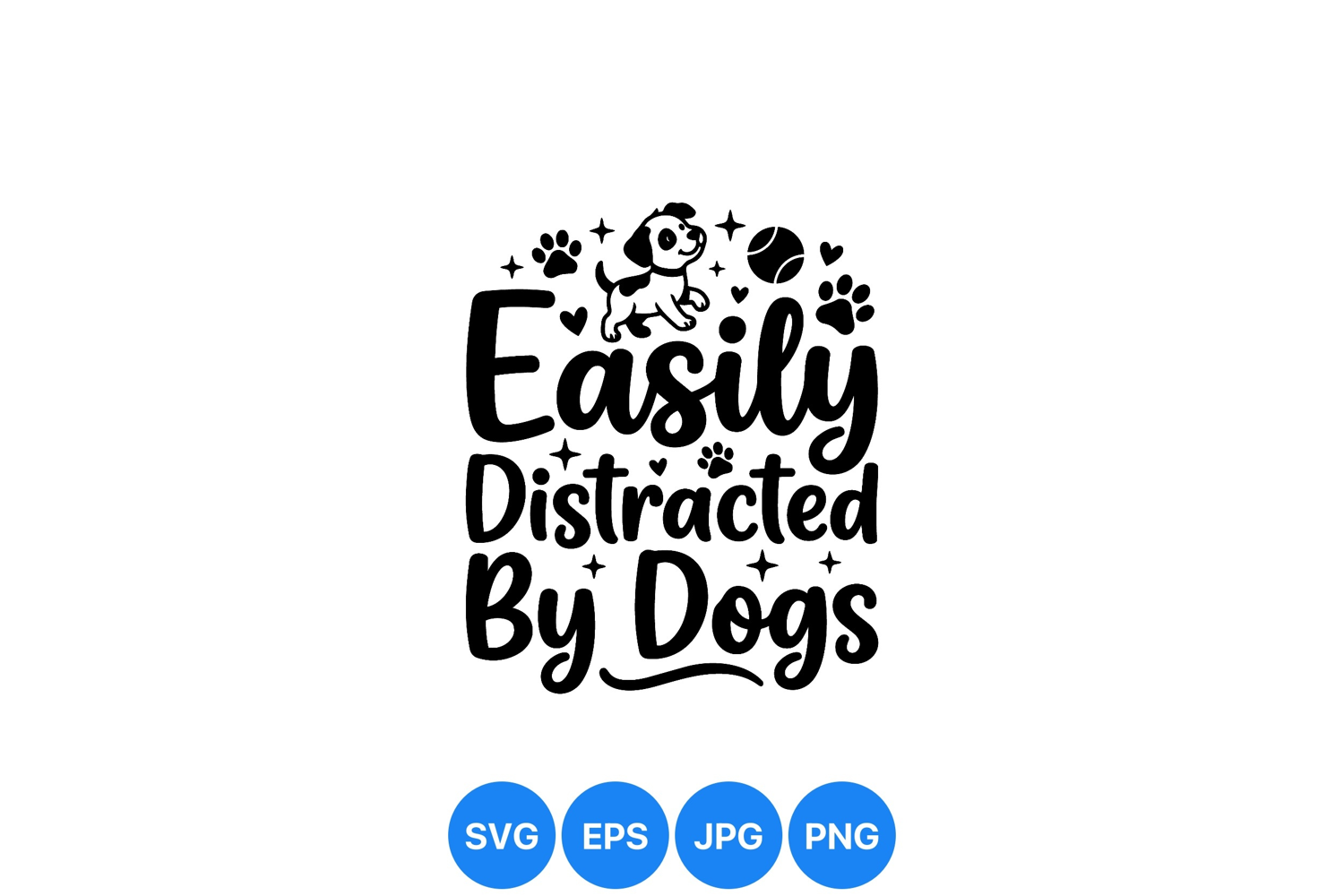 A simple black and white vector showing playful dog with paw prints and tennis ball surrounding easily distracted by dogs text in hand lettering style conveying fun pet lover vibe.