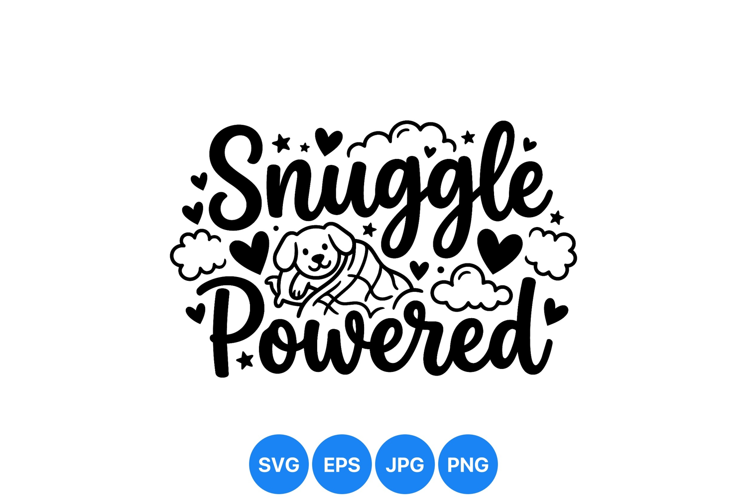 Playful illustration shows a cozy dog wrapped in a blanket with decorative hearts stars and clouds around the snuggle powered text in black and white charming style