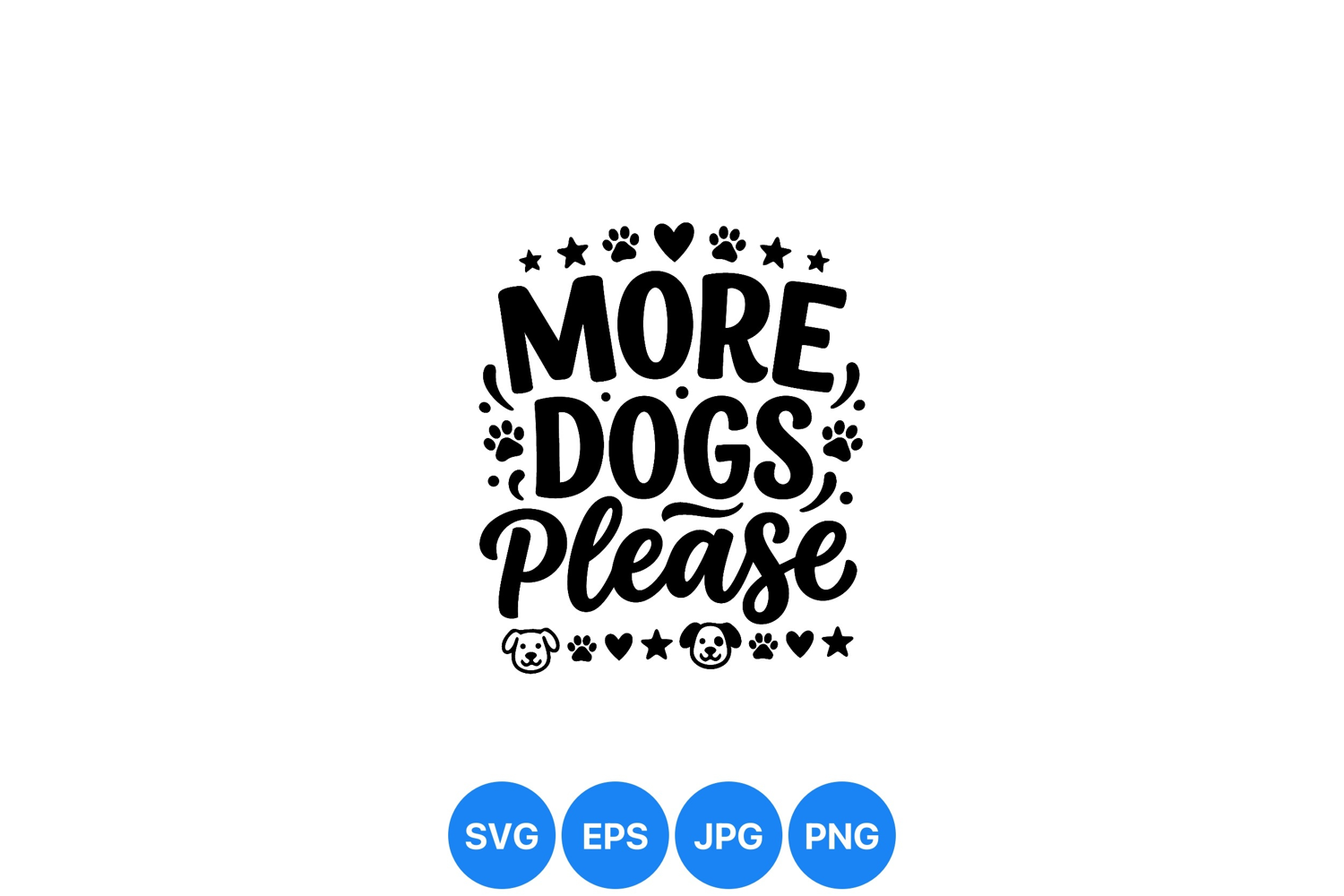 Bold black lettering reading more dogs please decorated with playful paw prints hearts stars and cute dog faces in minimalist vector style conveying love for dogs.