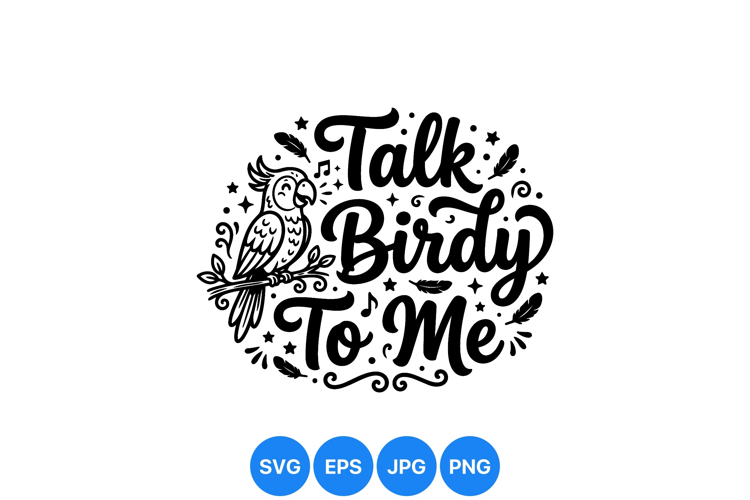 A cheerful parrot perches on a leafy branch singing surrounded by playful lettering talk birdy to me with feathers and stars in black and white vibrant style