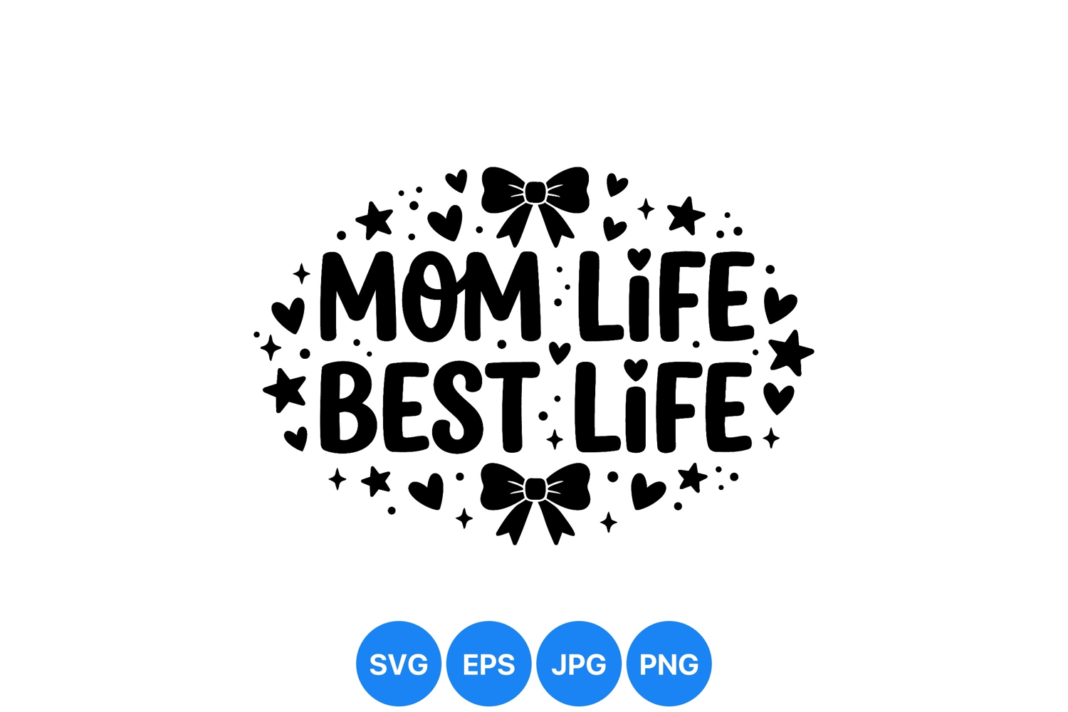 Hand drawn style black typography design reading mom life best life with decorative hearts stars and bows in a simple playful vector illustration