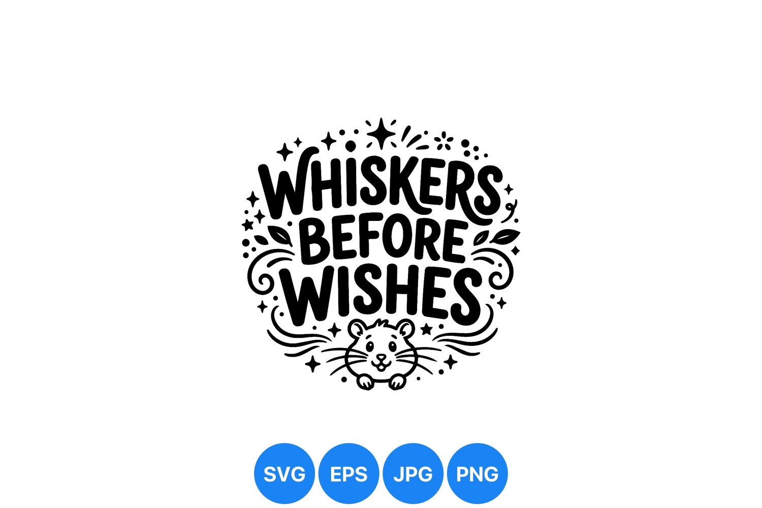 A playful black and white vector art design featuring whiskers before wishes text with an adorable hamster face and decorative dots and leaves creating a whimsical mood