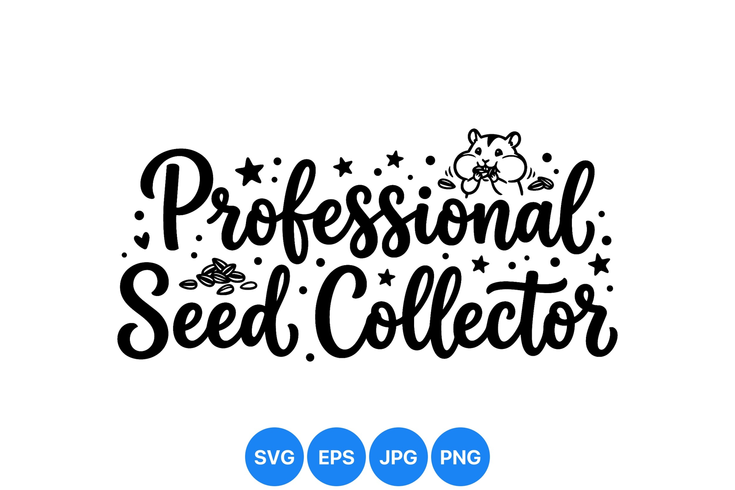 Hand lettered phrase professional seed collector with a cute hamster nibbling seeds surrounded by stars and seed elements in black and white vector style playful and charming
