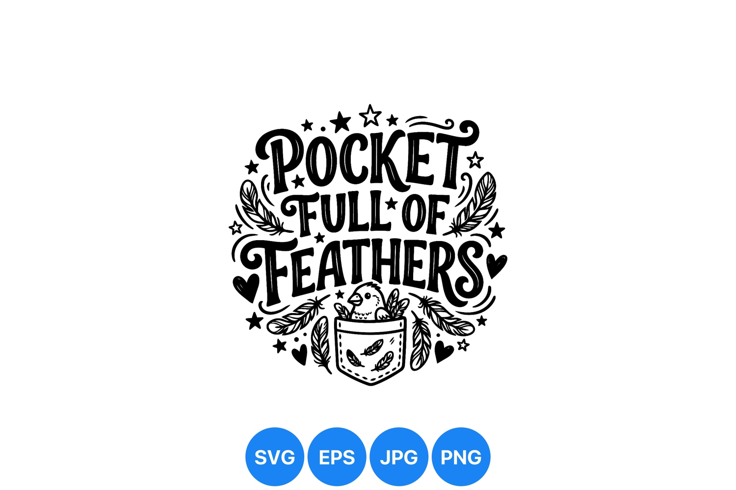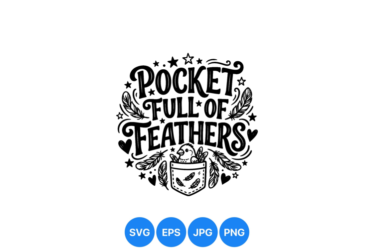 Black and white vector art with whimsical hand lettering saying pocket full of feathers surrounded by stars hearts and feathers in playful style
