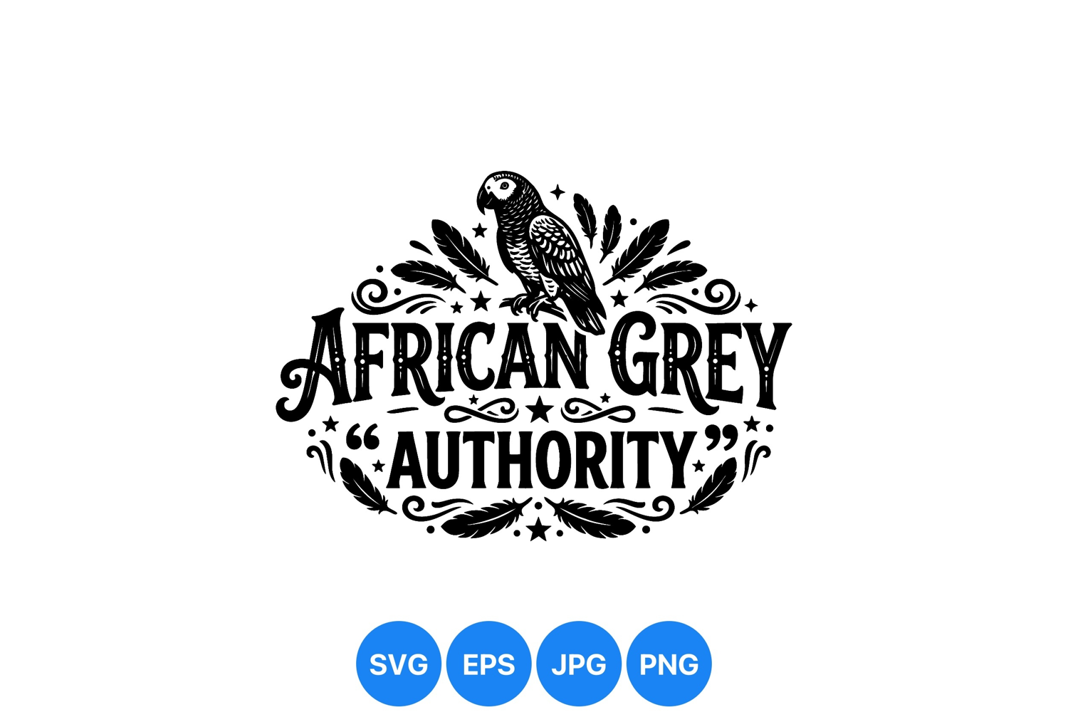 A vintage style black and white illustration featuring african grey parrot perched with decorative feathers and star elements surrounding the word authority in classic typography design