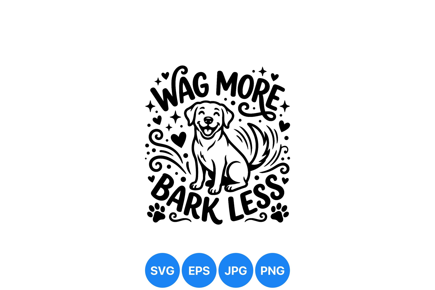 A cheerful dog with wagging tail surrounded by decorative hearts and paw prints illustrates the motivational phrase wag more bark less in black and white line art style conveying positivity and joy.