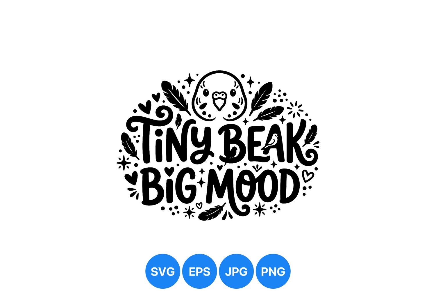 A hand drawn lettering design with the phrase tiny beak big mood features a bird face with scattered decorative feathers hearts and stars in black