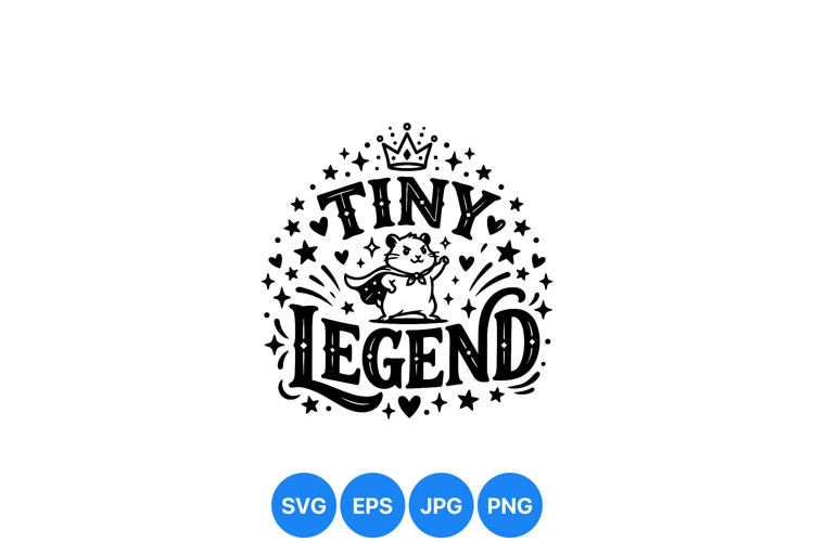 A bold black and white vector depicts a tiny confident hamster wearing a cape framed by stars hearts and a crown with lettering reading tiny legend in a playful style