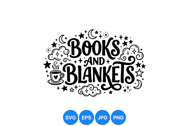 Black and white hand drawn style lettering spells books and blankets surrounded by stars moons clouds and a coffee cup conveying cozy relaxing night vibes.