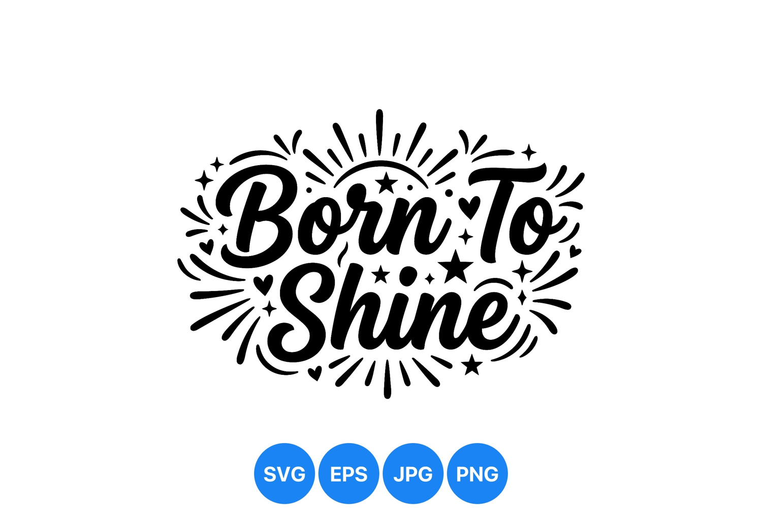 Inspirational hand lettering reading born to shine surrounded by decorative stars hearts and burst rays creating a bold uplifting message and joyful mood