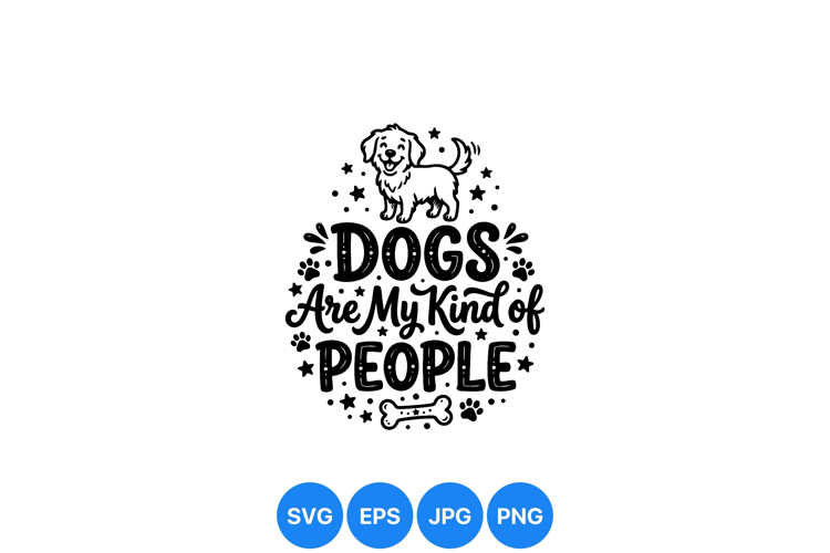 A charming happy dog illustration placed above playful lettering saying dogs are my kind of people surrounded by paw prints bone and stars creating a friendly mood