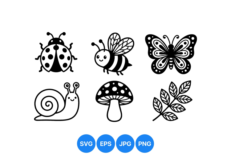 Black and white vector icons show smiling ladybug bee butterfly snail mushroom and leaf with simple cartoon style suitable for children educational materials or nature themed designs cute and friendly