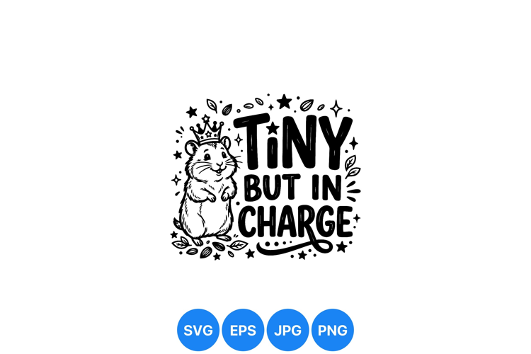 Playful black and white vector illustration of a crowned hamster standing beside bold lettering tiny but in charge with decorative stars and leaves creating fun energetic mood