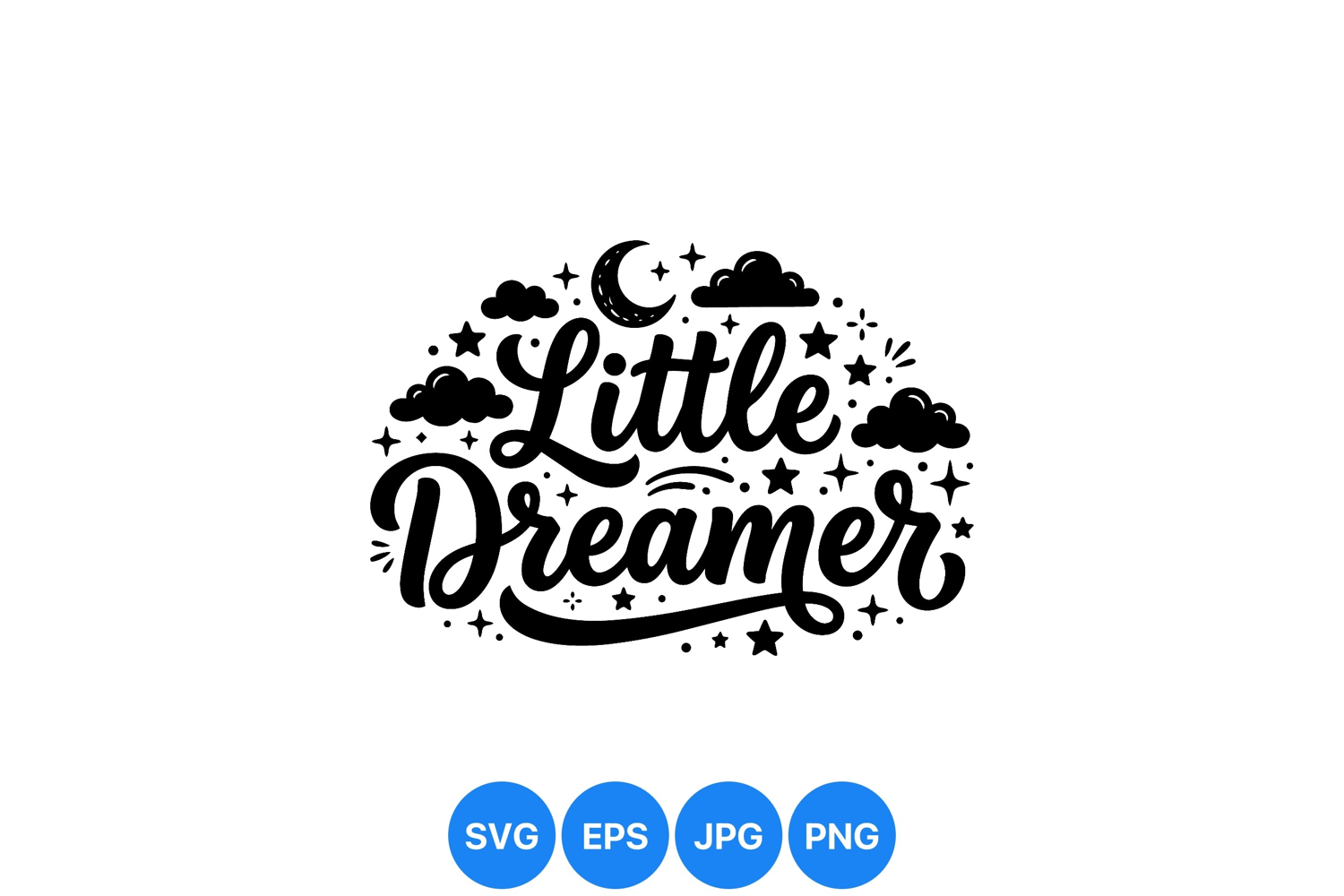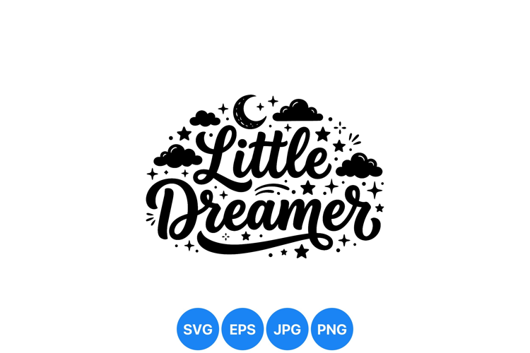 Hand lettering design featuring the phrase little dreamer surrounded by crescent moon clouds and star accents in black vector style for inspirational and decorative use