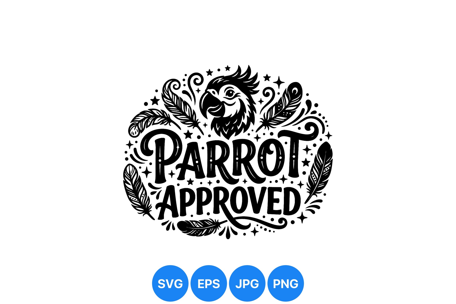Intricate black and white vector design featuring a detailed parrot head with decorative feathers and swirling elements, combined with bold text reading parrot approved in a playful style