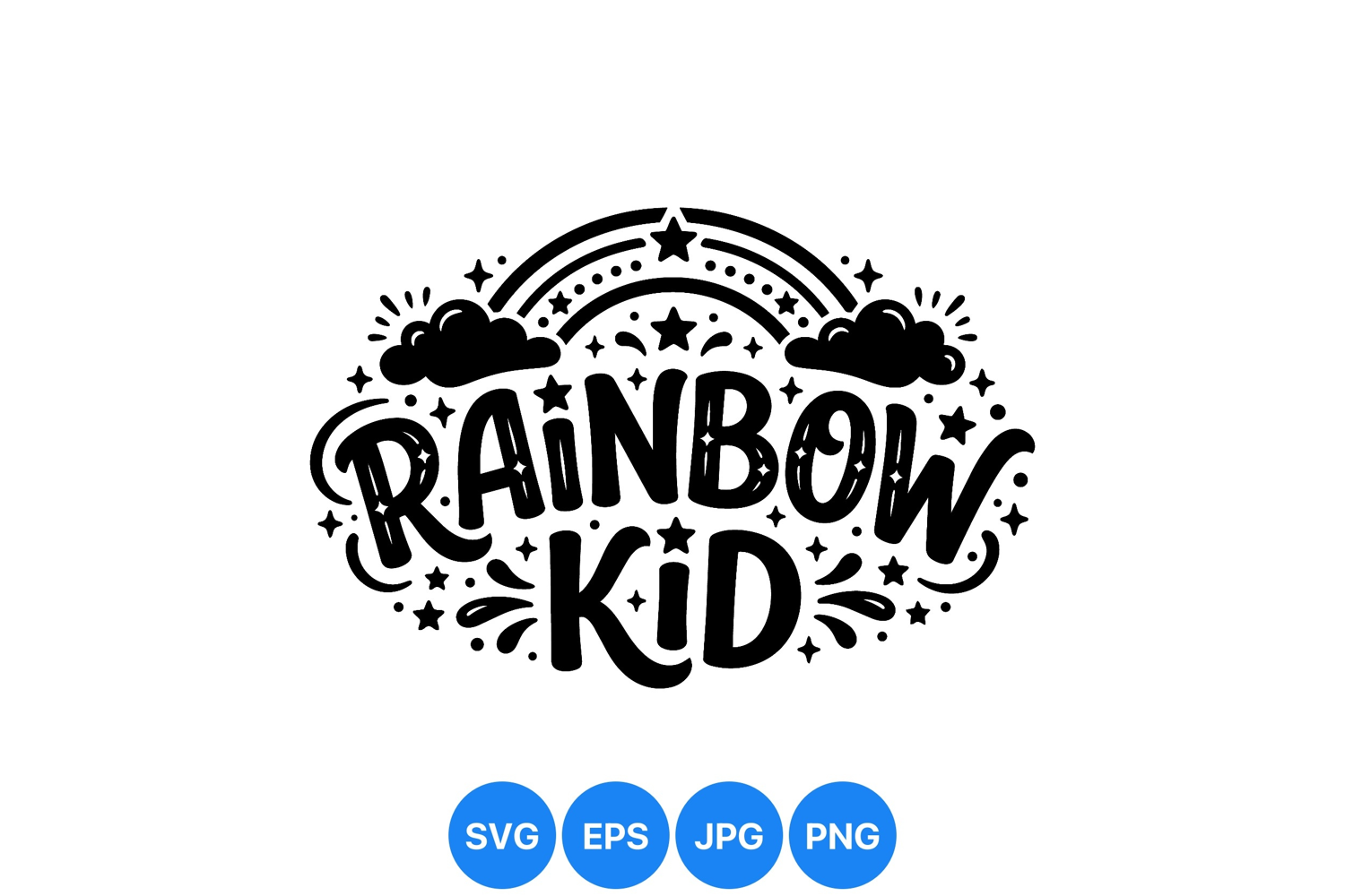 A playful hand lettering design displays the words rainbow kid surrounded by stars and clouds in black and white style with decorative vector illustration on white background