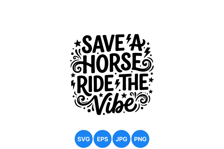 A black and white hand lettering design reading save a horse ride the vibe surrounded by decorative stars and swirls in a playful and uplifting style suitable for inspirational branding.